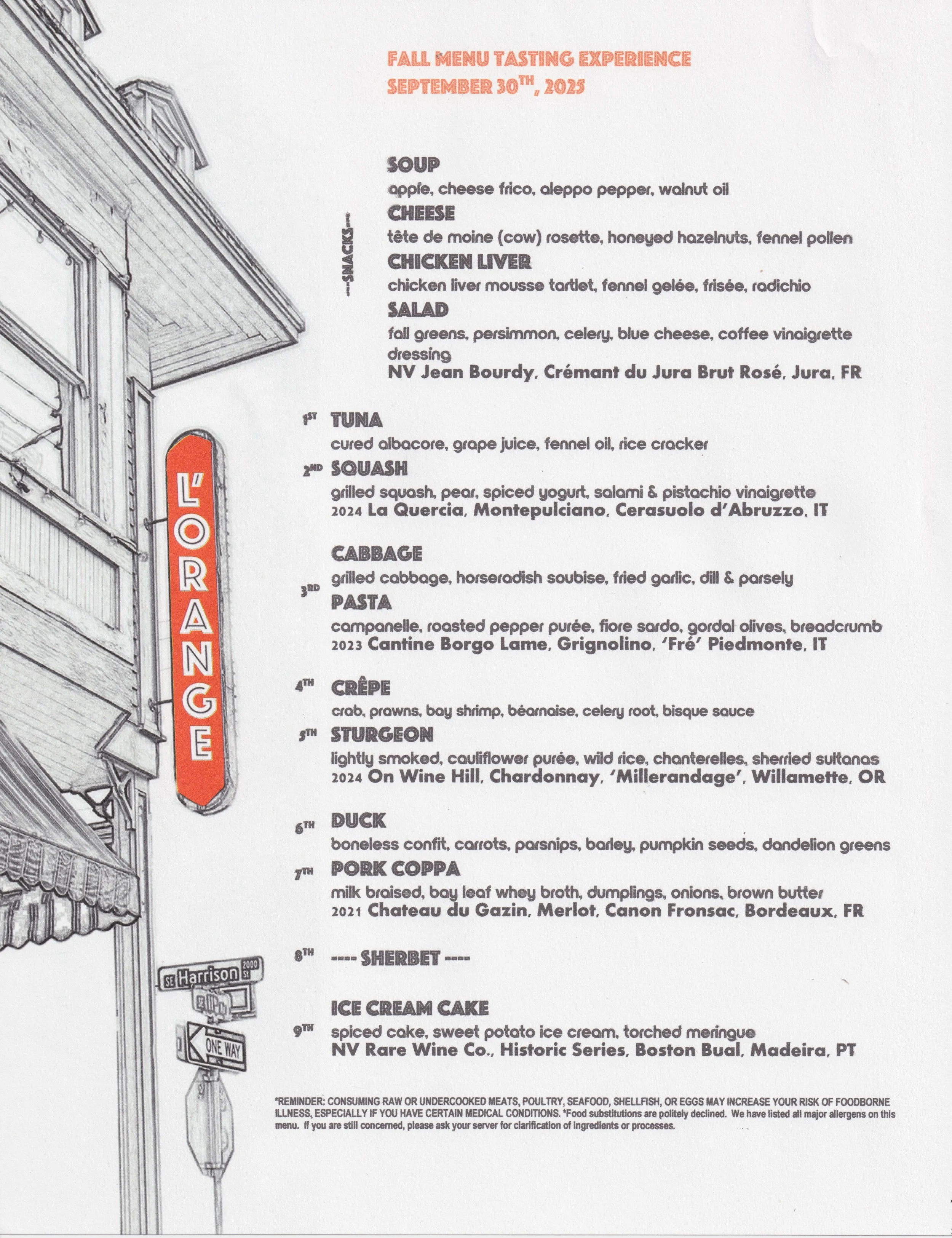 Our FALL PREVIEW TASTING MENU EXPERIENCE IS cOMING September 30th, 2025. You will be the first to taste the entire new menu from start to finish. We have broken this up into 12 Courses + bonus items. In addition, we will feature many of the new wines by the glass as well as our non-alcohol options. This will be a comprehensive preview of what Fall will taste like at L'Orange.